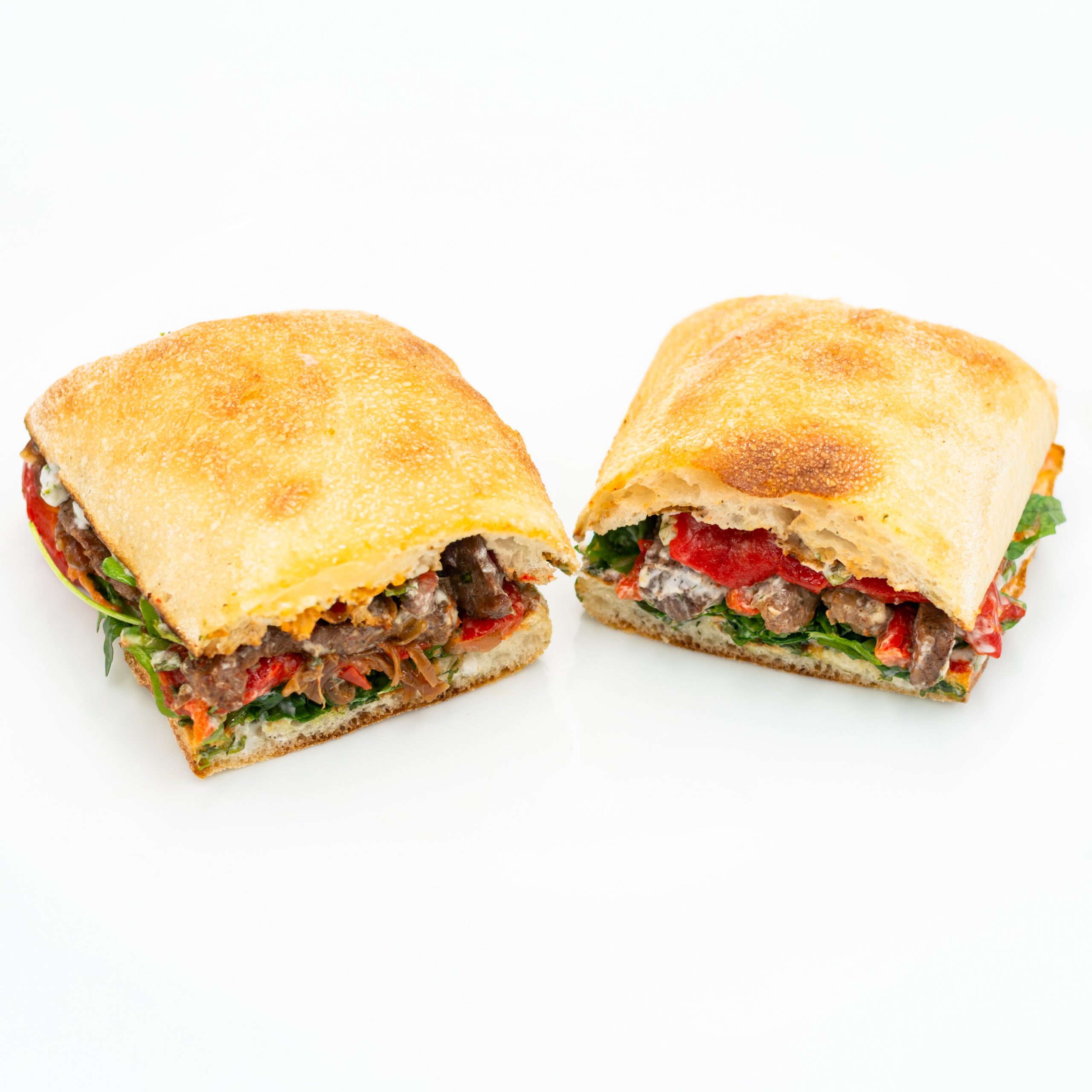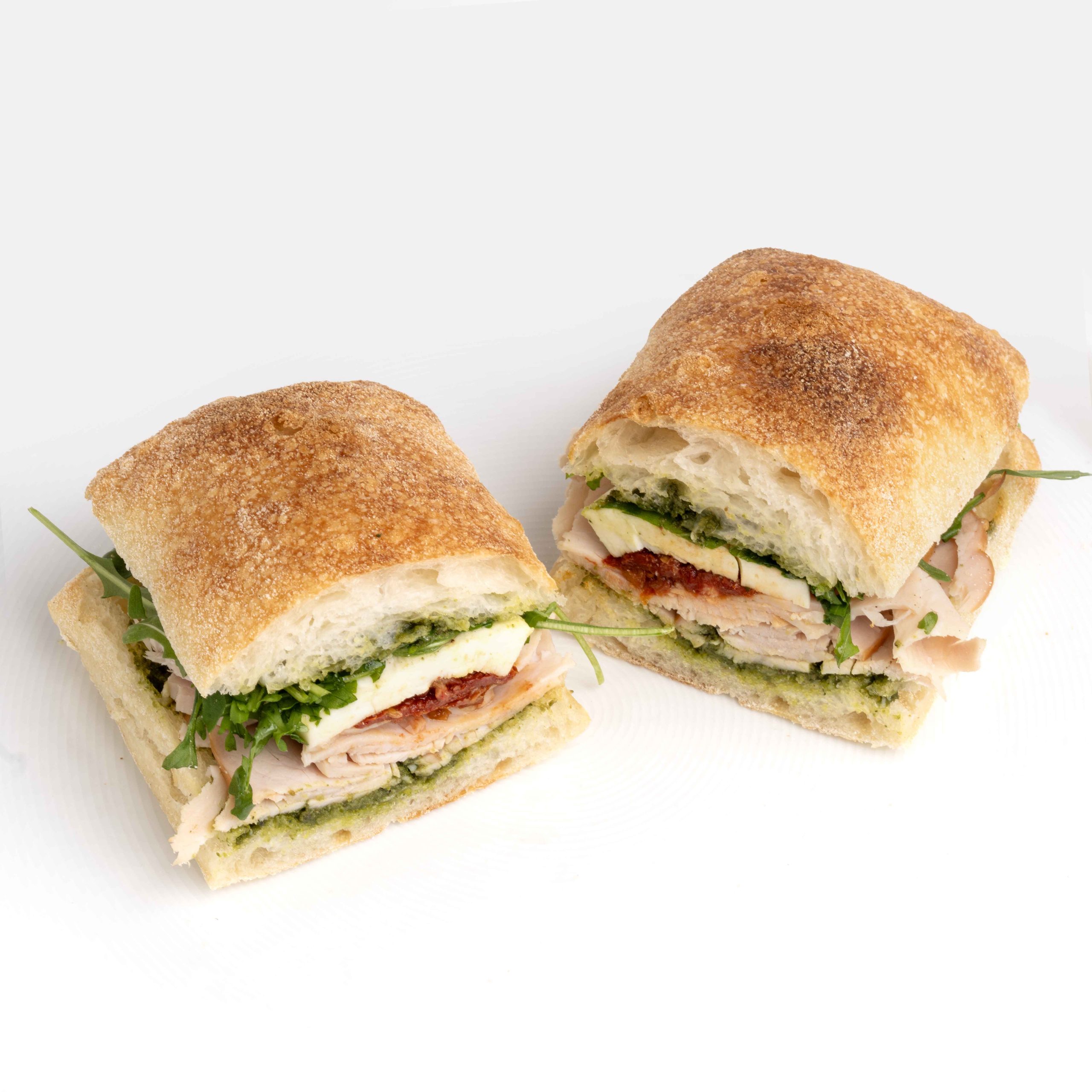 نان چاباتا، سینه بوقلمون، سس پستو، گوجه خشک مزه‌دار شده، پنیر موتزارلا، روکولا