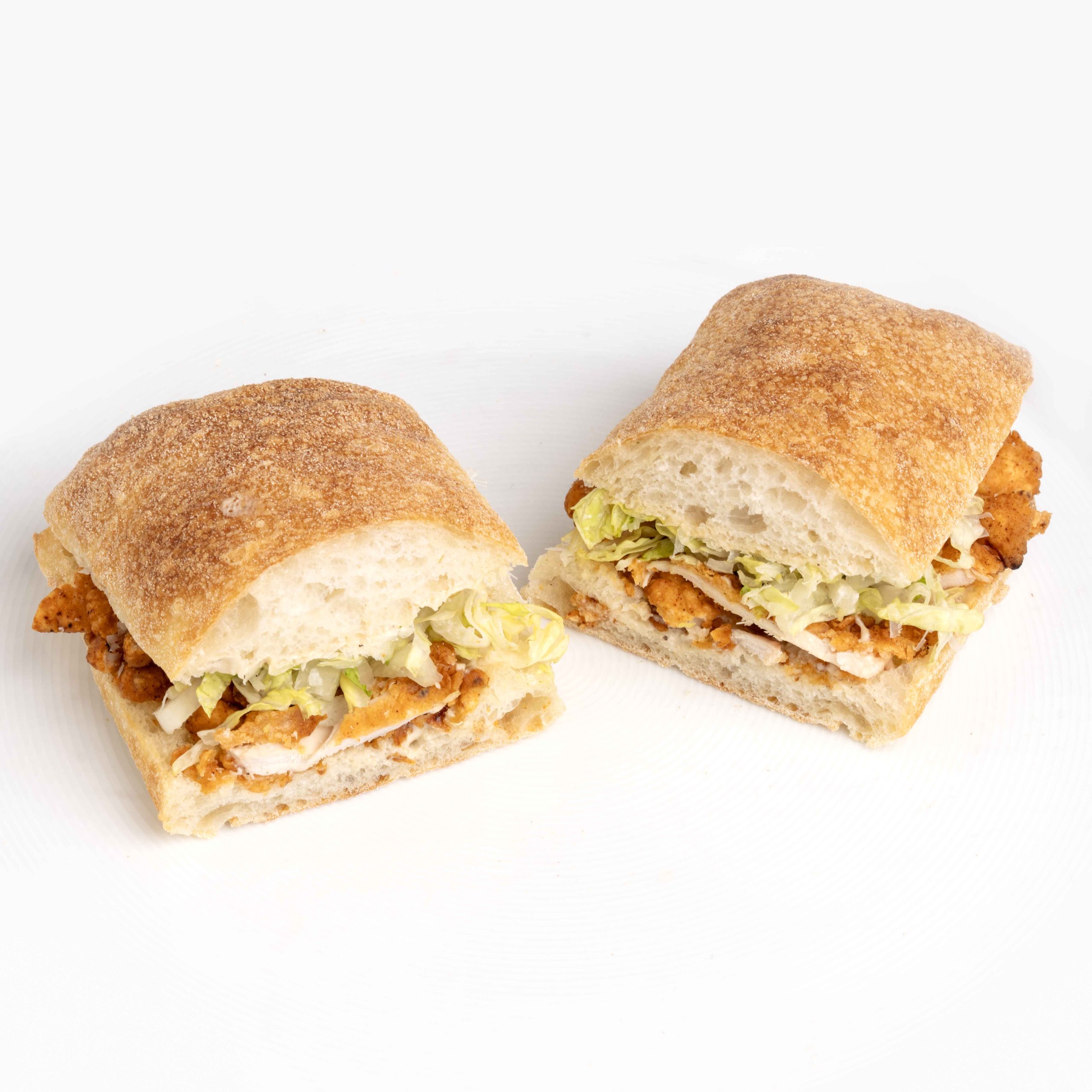 نان چاباتا، سینه مرغ سوخاری، سس سزار، کاهو، پنیر پارمژان