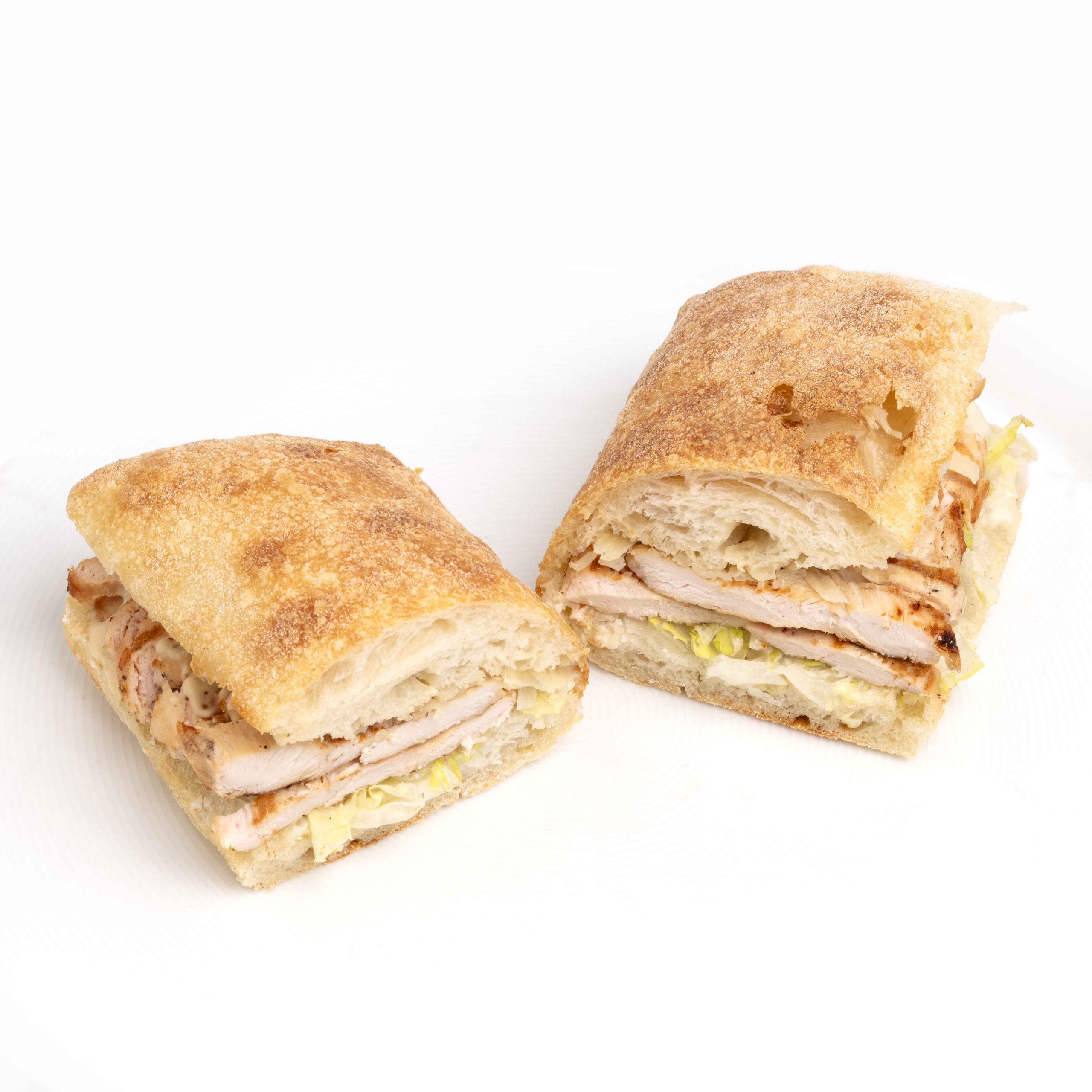 نان چاباتا، سینه مرغ گریل، سس سزار، کاهو، پنیر پارمژان