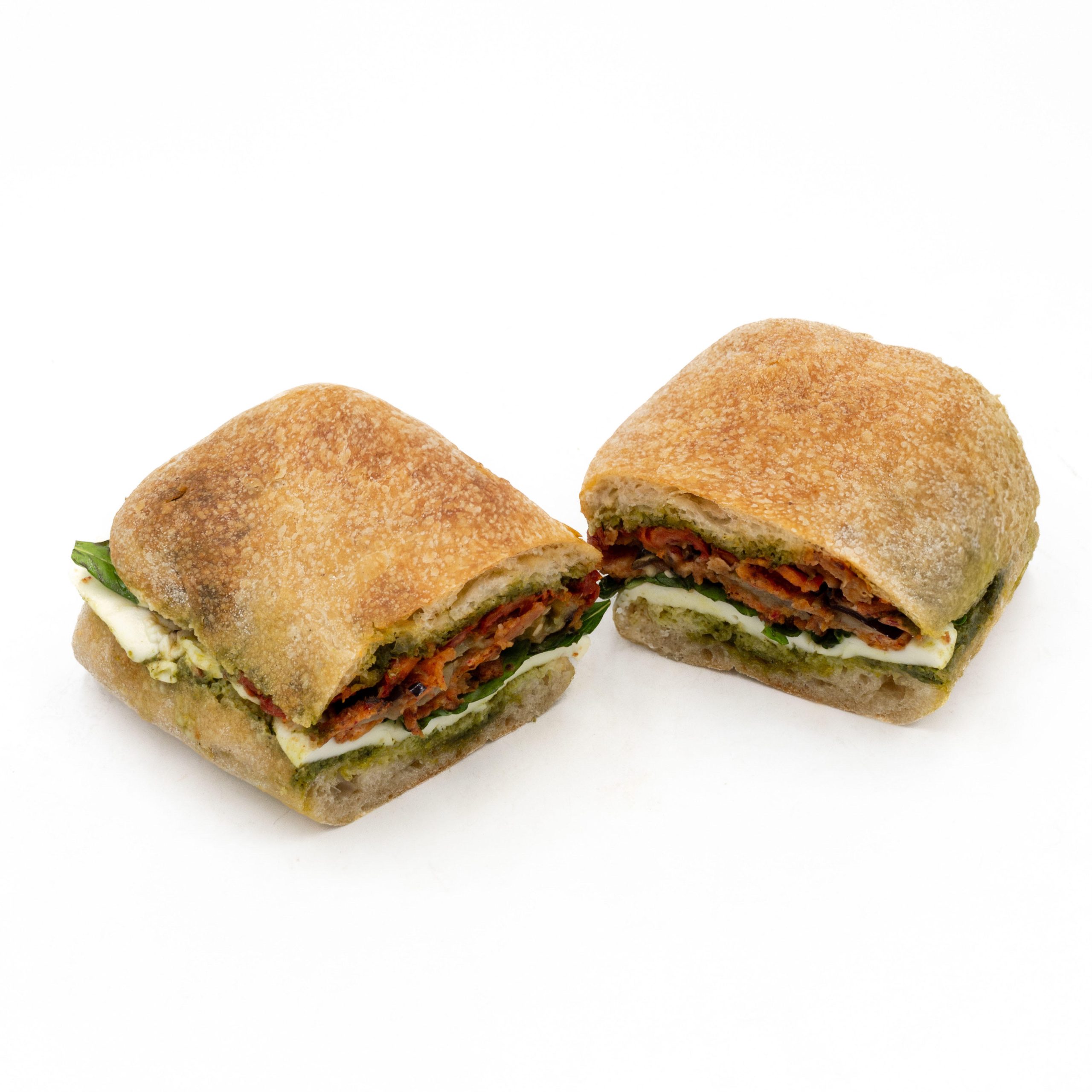 نان چاباتا، سس پستو، بادمجان سوخاری، پنیر موزارلا، گوجه خشک مزه دار شده، ریحان