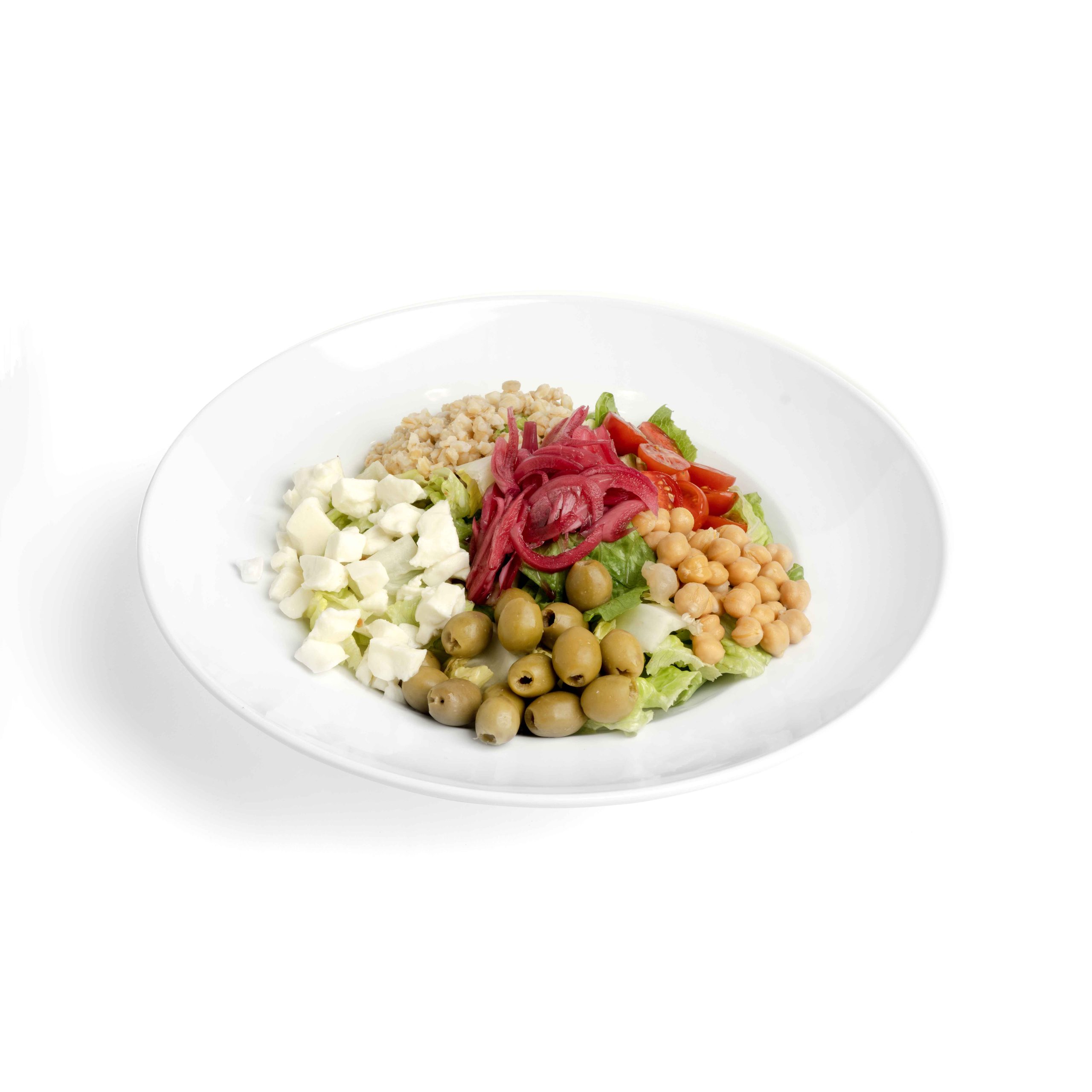گندم، کاهو رسمی، گوجه گیلاسی، زیتون، ترشی پیاز، نخود، پنیر موتزارلا، سس وینگرت اورگانو