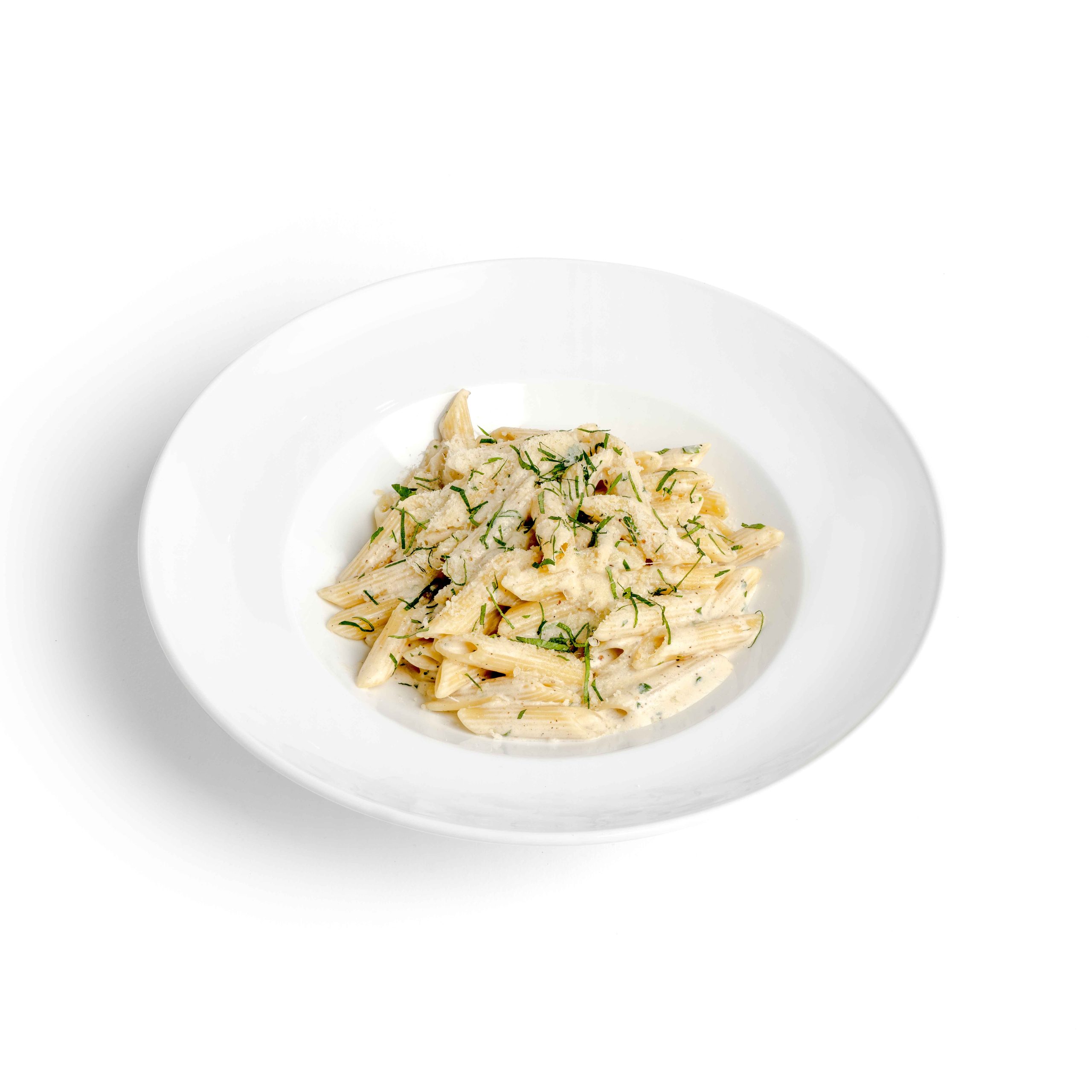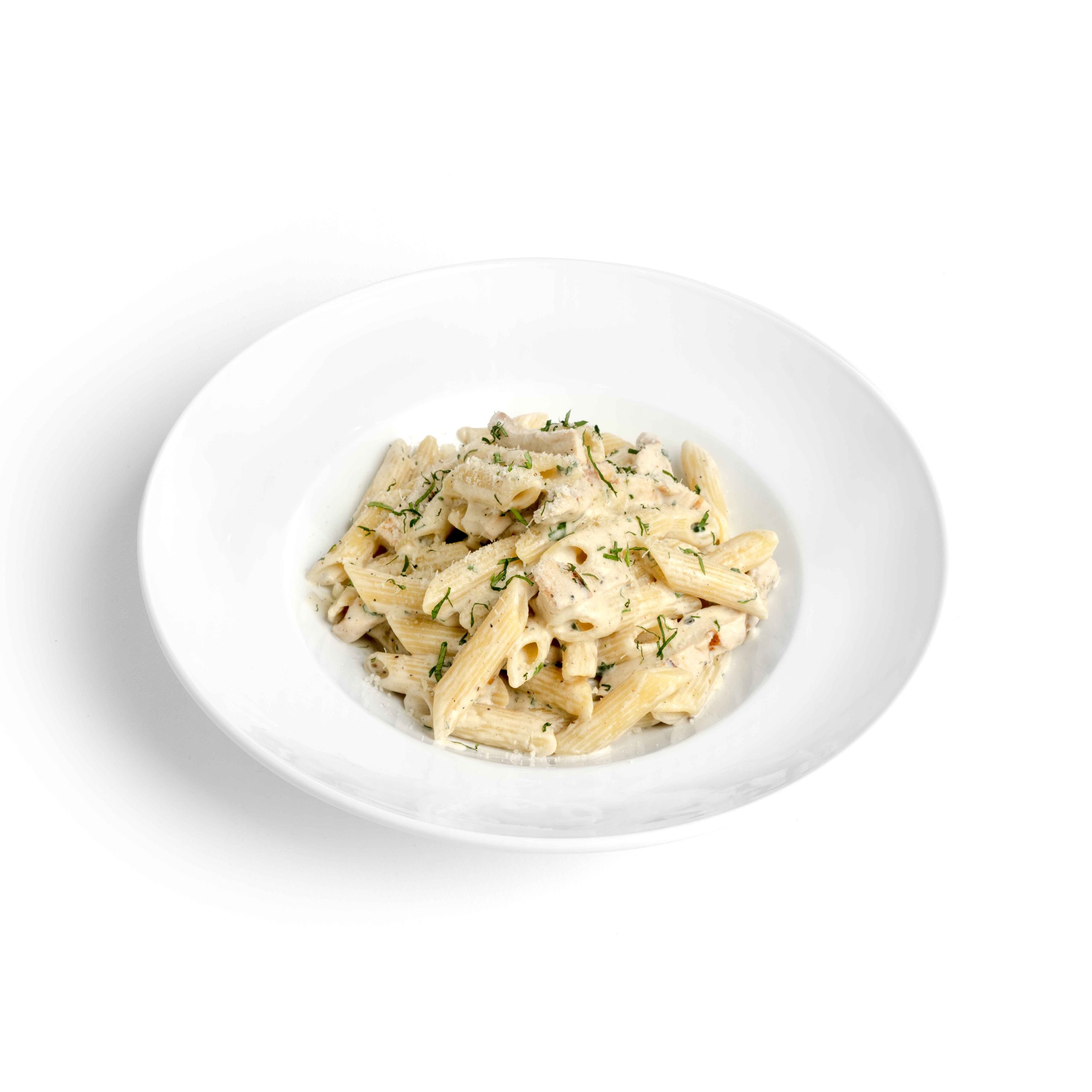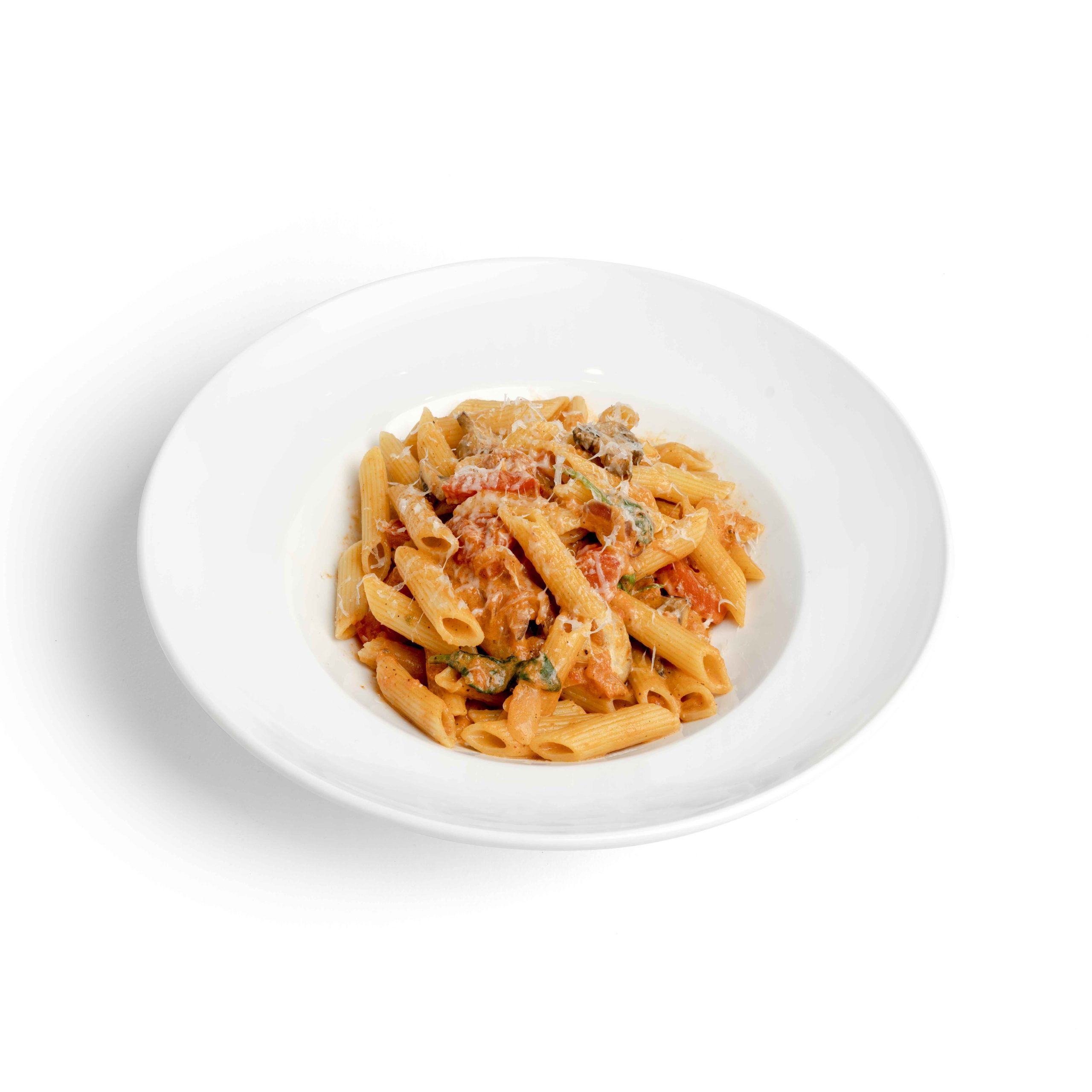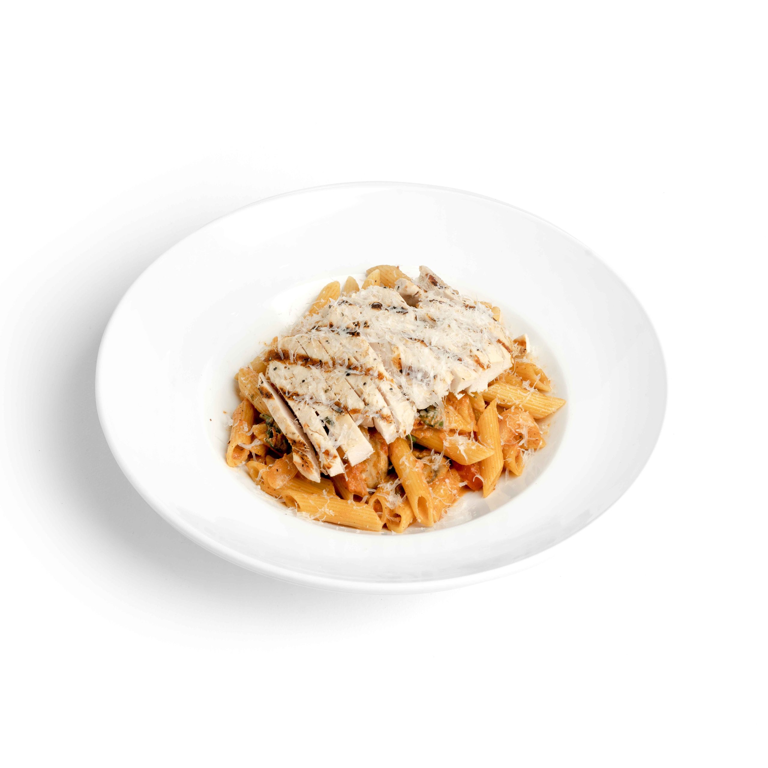 پنه، سس مارینارا با خامه، مرغ گریل، قارچ، بیبی اسفناج، گوجه، پیاز، پنیر پارمژان