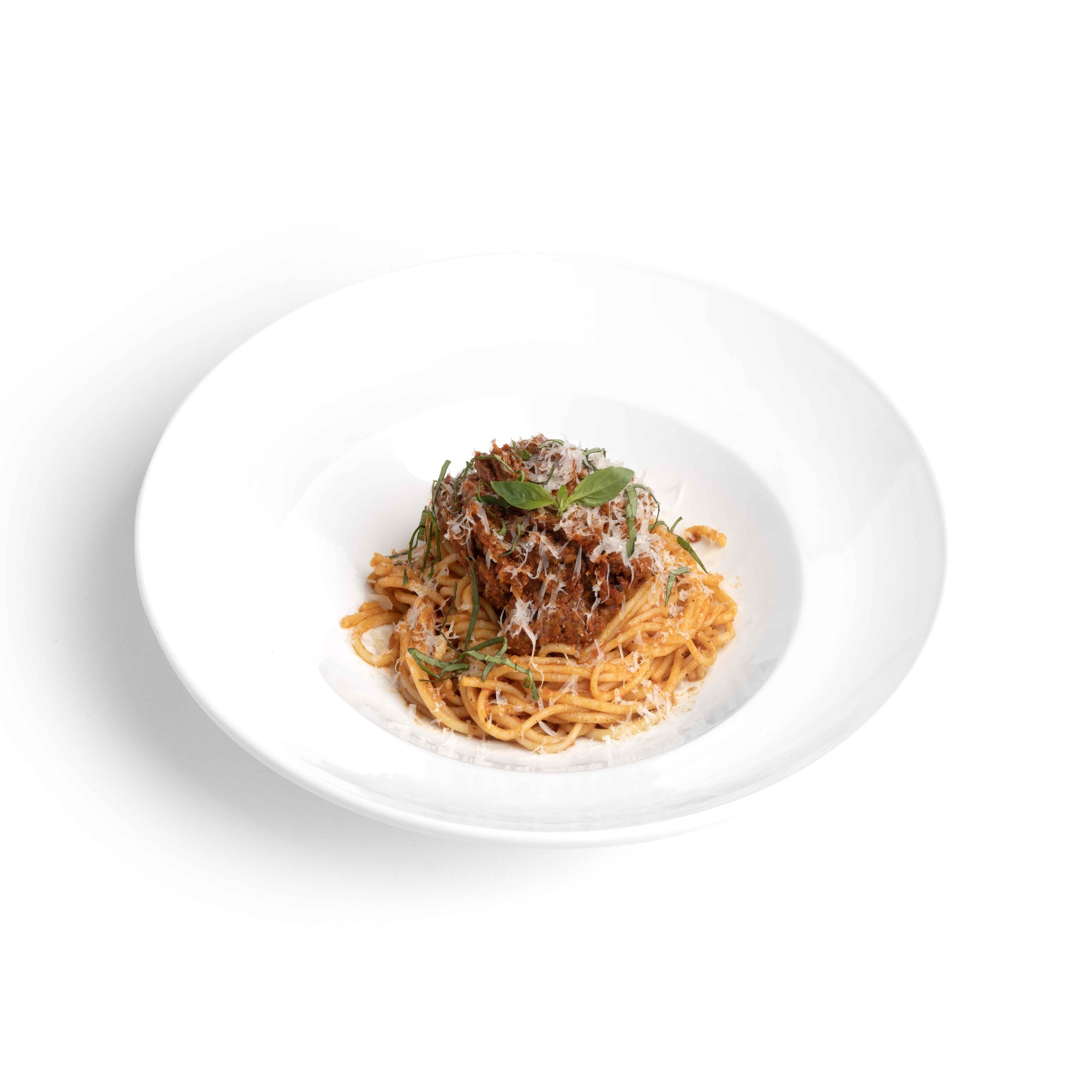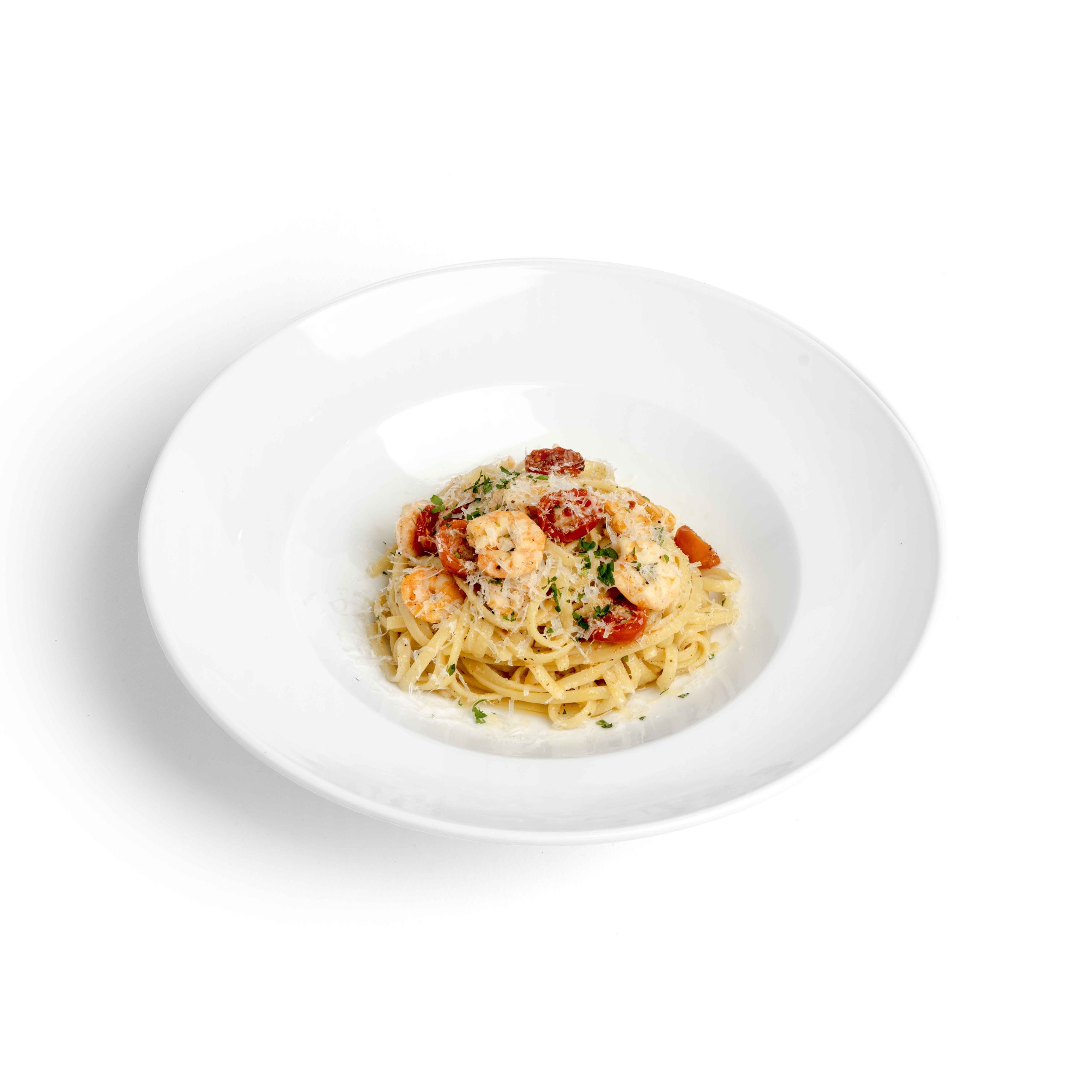 لینگوئینی، میگو تفت‌داده‌شده با کره و لیمو، پرک چیلی ، گوجه گیلاسی ، پنیر پارمزان، جعفری، روغن سیر